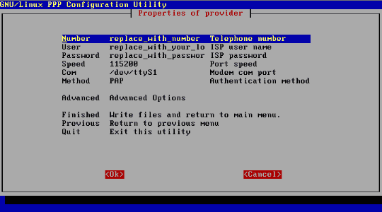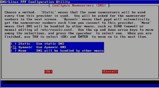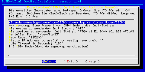 Wie ein Modem physisch an den Rechner angeschlossen wird, wurde im Kapitel Systemadministration Hardware-Installation besprochen. Der Schwerpunkt im folgenden Text soll nun auf die Einrichtung eines Zugangs über einen Internet Service Provider (ISP) liegen, also die Schritte der Konfiguration, um mit einem simplen Befehl oder Mausklick den automatischen Zugang zum Internet aufzubauen. Debian: pppconfigPPP? ProviderName, DNS, Protokoll, dann USername bei ISP, Passwort, Baudrate , Pulse oder Tonwahl, Nummer des ISP, Automatischer Test, wo Modem hängt. Nochmals Zusammenfassung und Möglichkeit der Änderung der einzelnen Einträge
