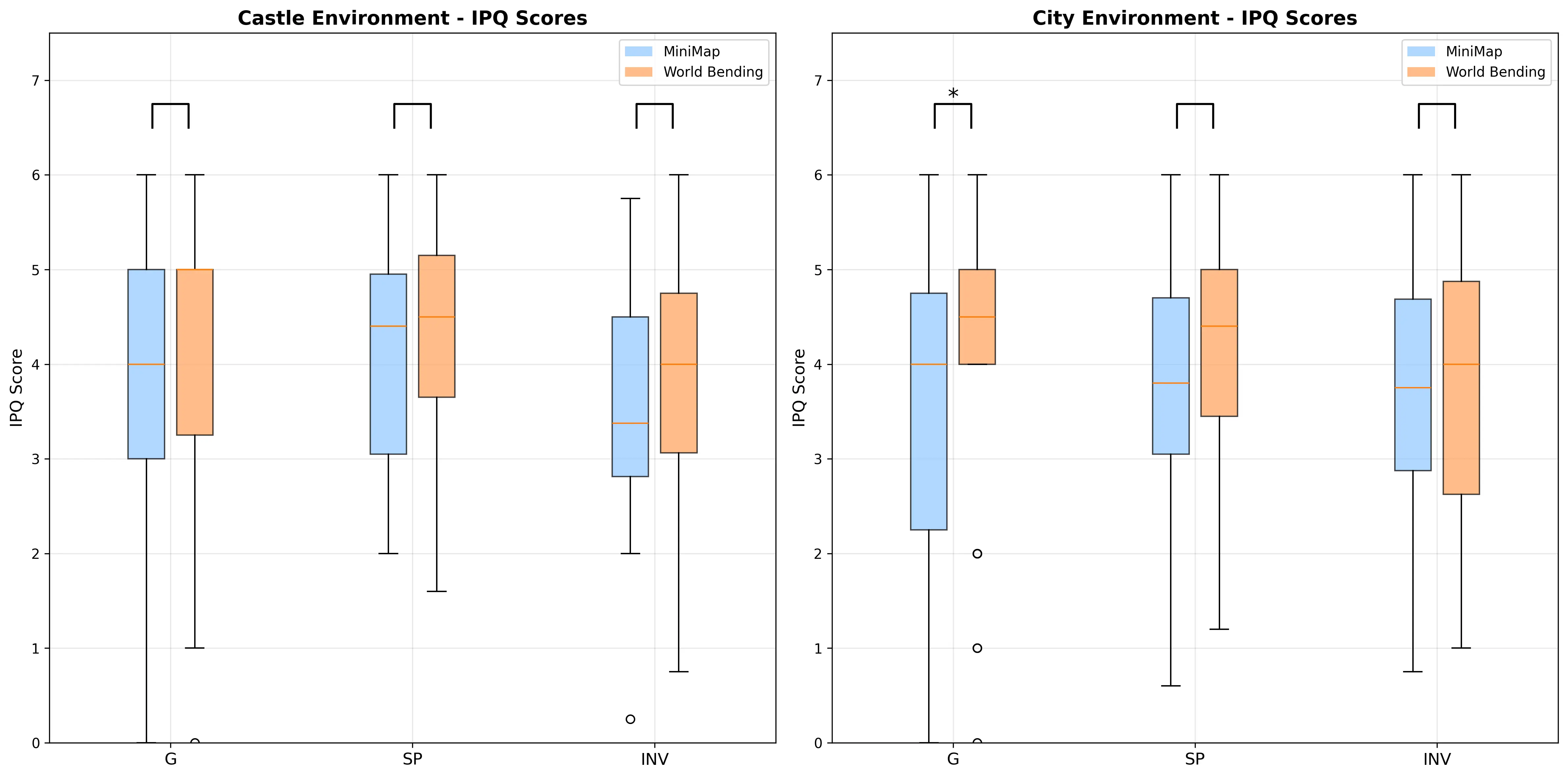 The Igroup Presence Questionnaire results for the dimensions general (G), spatial presence (SP), and involvement (INV) for each environment and locomotion method.