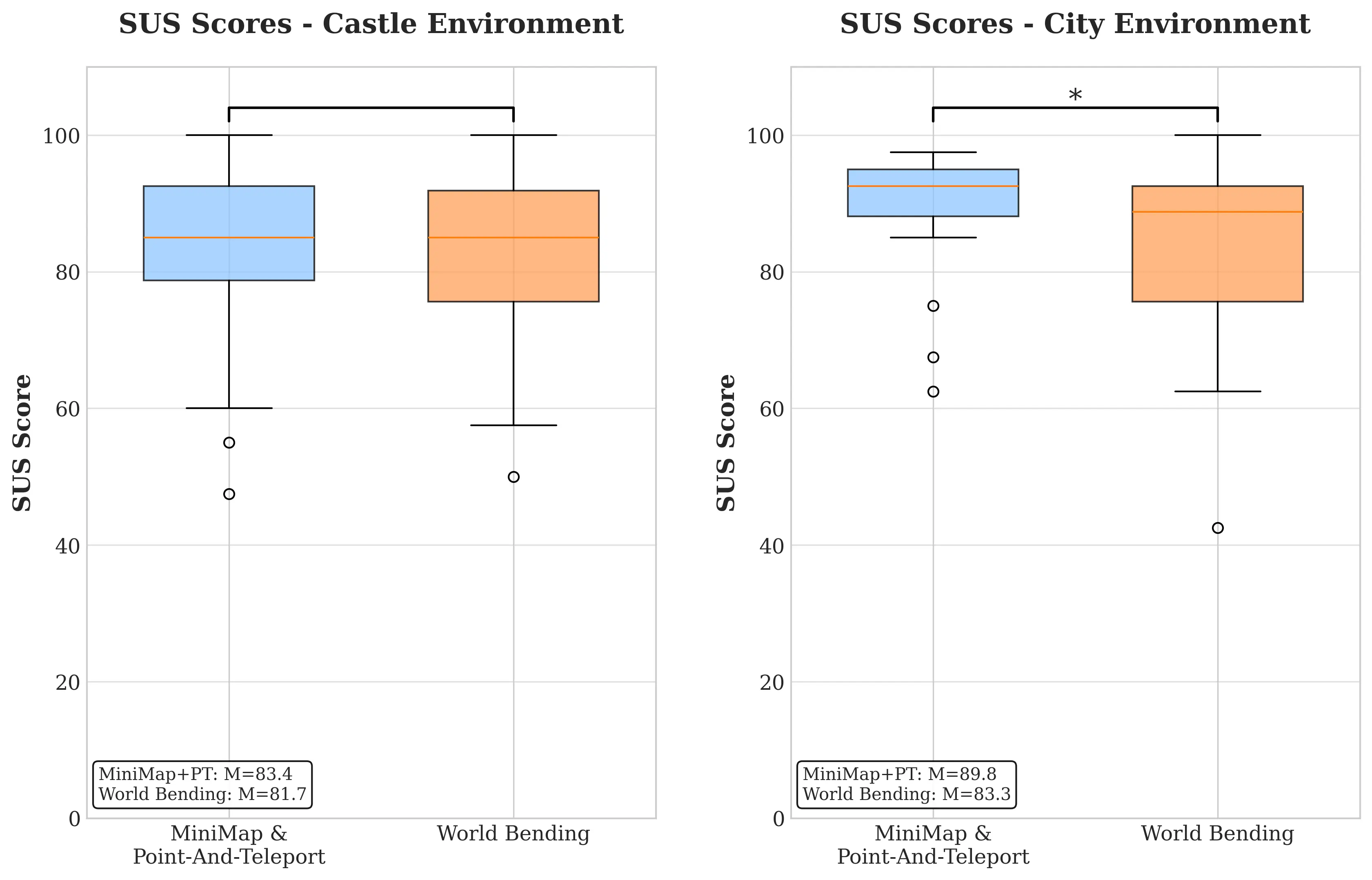 Despite the Mini-Map receiving slightly higher subjective usability ratings, the System Usability Scale (SUS) score for the improved World Bending Teleport was still classified as “excellent”, confirming high overall usability. Participants additionally reported a stronger sense of presence and rated the method as more immersive and engaging, making it the preferred approach even when the Mini-Map felt more familiar.