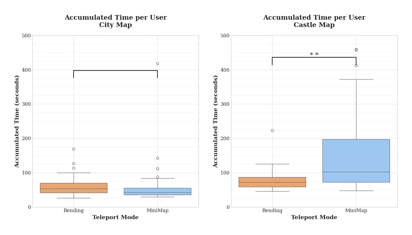 The user study with 26 participants showed that the extended World Bending Teleport substantially improves long-distance navigation. In the Castle environment, participants needed far fewer teleports, reached destinations significantly faster, and showed a large effect size in reduced effort compared to the Mini-Map method. In the City environment, the method performed equally fast on short-distance tasks, cutting both task completion times and teleport counts roughly in half compared to the earlier implementation. Motion sickness remained low for both methods.