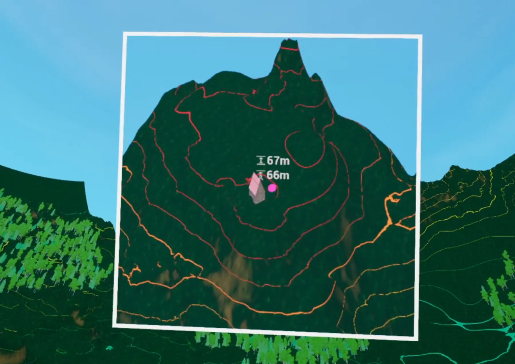 To address missing depth cues from the original approach, two forms of elevation feedback were implemented: a numerical height display attached to the teleport pointer and colored height-contour lines rendered directly onto the terrain. These lines are generated by sampling each vertex’s world-space height and mapping it to a custom color gradient, allowing users to estimate elevation even while the world is bent.